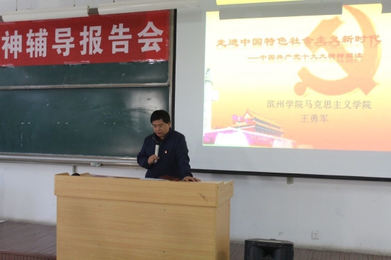 会议邀请马克思主义公司王勇军博士作了题为《走进中国特色社会主义新时代——中国共产党十九大精神》的专题报告。王勇军博士围绕十九大报告的主题、框架、创新对十九大精神进行了全面阐释和系统讲解。王勇军博士在报告中指出,学习贯彻十九大精神,重点是要牢牢把握和深刻理解党的十九大报告的鲜明主题,深刻领会习近平新时代中国特色社会主义思想的历史地位和丰富内涵,深刻认识五年来党和国家取得的历史性成就,深刻认识中国特色社会主义进入新时代和新时代党的历史使命,深刻理解我国社会主要矛盾的变化,深刻理解实现“两个一百年”奋斗目标的战略部署,深刻认识坚定不移推进全面从严治党的重大意义,进一步坚定“四个自信”,进一步增强“四个意识”,努力推进新时代中国特色社会主义伟大事业新发展。
