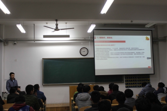 12月27日晚上7点,2014级员工党员姜涛同学在8教108为2017级入党积极分子讲解十九大精神微课堂。姜涛同学结合自己考研复习中学习党的有关理论知识的认识,讲解了我们新时代的新变化,和我们国家未来的发展方向,并指出我们当前和今后一个时期的首要政治任务是学习贯彻党的十九大精神,把十九大精神落实到实际学习生活中。同学们认真聆听并做好笔记,更加深入的学习到了党的十九大精神。