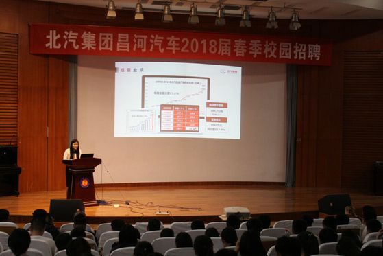 昌河汽车集团的讲解人员给同学们讲解了其公司的大体情况,包括旗下品牌、公司待遇、公司规模、招聘要求、招聘对象以及在未来几年的发展规划,毕业同学们认真聆听,非常重视自己的就业问题,一边倾听一边思考与自己的就业方向是否相同。随后,北汽集团昌河汽车的员工给同学们做了现场答疑,同学们积极提出自己的疑问,现场气氛激烈,最后同学们都上交自己的简历,希望自己可以参加后面的面试,得到一份自己喜欢的工作。