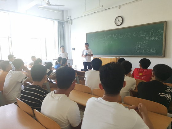 在班主任助理带领18级新生们参观完公司和实验室后,班主任助理们将各个班级的同学带到了各自的教室,在各个教室里,班主任助理们先对18级新生们表示了热烈的欢迎,向18级的新生们介绍自己,并且将在机电工程公司里需要注意的事项无所保留的传授给新生们,尤其是在军训期间的生活问题,例如做好防晒工作,不能缺水,要顿顿吃饭,不能空腹去军训,将自己在往年军训中得到的经验与教训都传达给18级的新生们,希望新同学们能够更好的适应新生活。另外,2018级新生们也都做了自我介绍,展示自己的才艺和讲述自己大学的感受,这场见面会开展的十分顺利。
