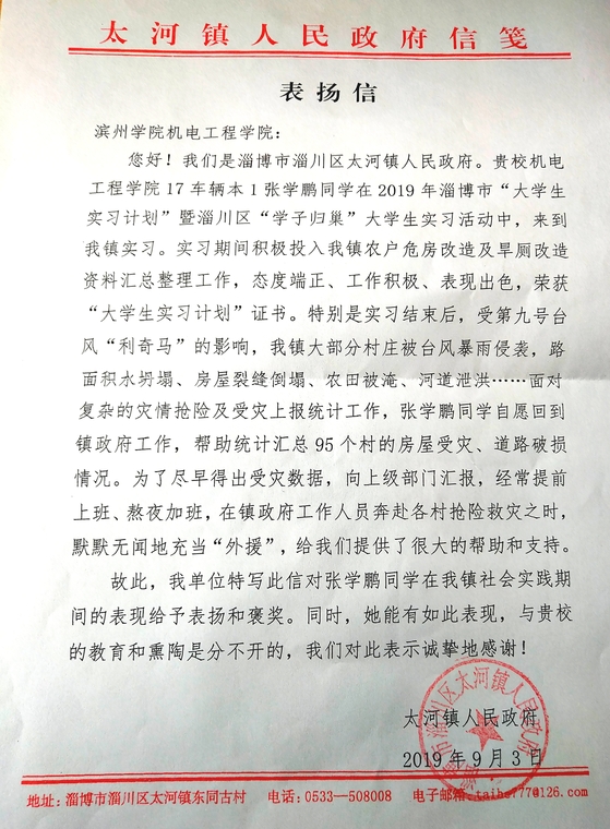 从该表彰信中得知,张学鹏同学在该单位实习期间实习期间积极投入太河镇农户危房改造及旱厕改造资料汇总整理工作,态度端正、工作积极、表现出色,荣获“老员工实习计划”证书。特别是实习结束后,受第九号台风“利奇马”的影响,我镇大部分村庄被台风暴雨侵袭,路面积水坍塌、房屋裂缝倒塌、农田被淹、河道泄洪………面对复杂的灾情抢险及受灾上报统计工作,张学鹏同学自愿回到镇政府工作,帮助统计汇总95个村的房屋受灾、道路破损情况。为了尽早得出受灾数据,向上级部门汇报,经常提前上班、熬夜加班,在镇政府工作人员奔赴各村抢险救灾之时,默默无闻地充当“外援”,给当地政府提供了很大的帮助和支持。