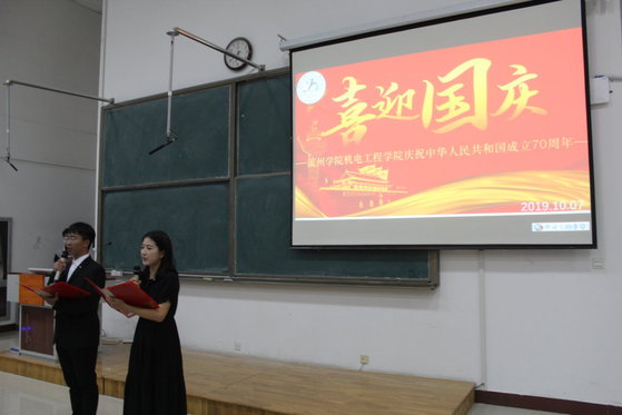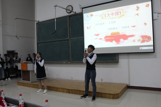活动伊始,主持人李亚楠同学与张雪蓬同学首先对来宾做了简单介绍,为新中国七十周年华诞献上了贺词。同学们以朗诵,歌唱等多种方式表达了对祖国的祝福。一句句感人肺腑的演讲,一声声满怀情感的歌唱使同学们热血沸腾,让现场气氛积极活跃,充分体现19级同学的爱国精神。随后,组织集体观看阅兵仪式,重温现场的庄严肃穆,感受国旗护卫队的英姿飒爽,斗志昂扬。一辆辆装甲车载着先进核武器向天安门广场开来,英雄纪念碑的上空几架冒着彩色烟雾的飞机列队驶过,在铿锵有力的口号中此次活动圆满结束。