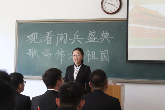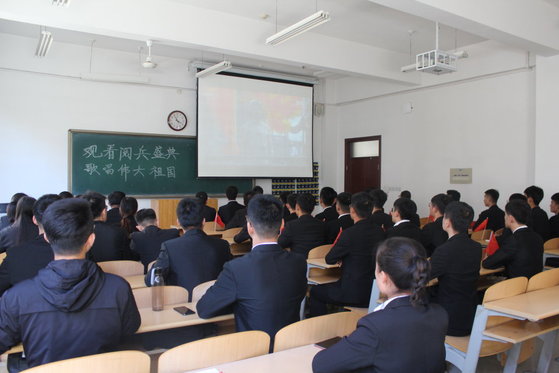 活动开始,全体参会人员首先观看了阅兵盛况,共同感受了祖国的强盛。观看过程中,同学们聚精会神凝视大屏幕,认真聆听习近平总书记重要讲话精神,当一个个气势恢宏威武昂扬的徒步方阵从眼前整齐踏过,当一辆辆科学化现代化精良的军事装备从镜头前频频展现,当一架架我国自主研制的各型战斗机成利剑般队形呼啸而过,现场掌声连动,在场同学无不为之震撼,不仅切实感受到了祖国70年来的沧桑巨变和举世瞩目的伟大成就,更是激发了作为中华儿女的民族自豪感和自信心,同时也让他们坚定了理想信念,明白了肩头责任之重。随后,19车辆本1班刘冰心一场《以青春之我,筑梦国家》的主题演讲将现场气氛推向高潮,充分展现了新时代莘莘学子深深的爱国之情。活动结尾,全体起立,齐声唱响《歌唱祖国》,同学们挥动手中的五星红旗为祖国庆生,祝愿伟大的祖国繁荣昌盛。