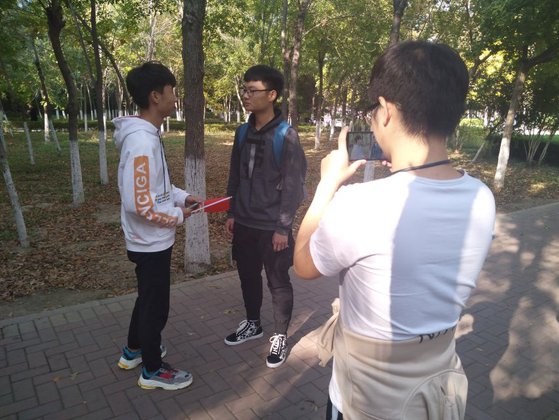 孙建国同学和马凯悦同学作为本次活动的记者。活动伊始,孙建国同学与马凯悦同学分别阐述了自己对青春、追梦的理解,点明了青春之梦的重要性,并在八教308对大一同学进行了随机采访,聆听了同学们奋力拼搏的故事,记者又对机械一班的丁宁同学做了采访,丁宁同学告诫大家要认真学习、勤奋进取,也表达了对同学们的美好祝愿。随后,跟随着记者的脚步来到了操场,对操场上的同学做了进一步的采访。通过采访我们了解了当代老员工的人生观、世界观、价值观,他们精彩的回答从不同角度展示了青年人们对国家梦、民族梦、个人梦的执着追求和憧憬,展示了他们在追梦过程中的蓬勃朝气和活力。最后,孙建国同学与马凯悦同学对此次活动进行了总结,尽力将最完美的影片展示给同学们。至此拍摄活动圆满结束。