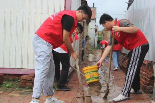 由于昨晚的强降水造成村里一部分下水道被淤泥堵塞,在巡村宣传的过程中队员们发现了有的村民家门前积水较多,存在的安全隐患。于是队员们就地开展志愿服务活动,主动借来邻居的工具帮助村民疏通下水道,排除积水,从而保证了村民的出行安全。