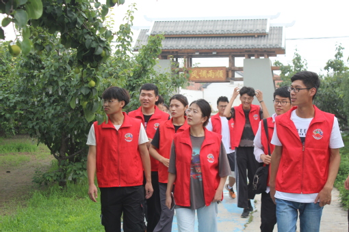 在金阳街道办事处办公室主任王超凡的带领下,队员们参观了百年梨园、梨寨、梨祖杜母等。队员们认真聆听了王主任有关于梨园的介绍:阳信鸭梨种类多样,已开发出了媚梨、丰水梨、早酥梨等20多个系列、56个品种的梨树。其中早酥梨生长时间短,上市早,品质优良,肉质细腻,最受欢迎;媚梨肉质细密,味甘甜浓香,果脆爽口,清甜多汁......漫步梨园之中,累累果实缀满枝头,令人心旷神怡,引得队员们不断驻足拍照留念。