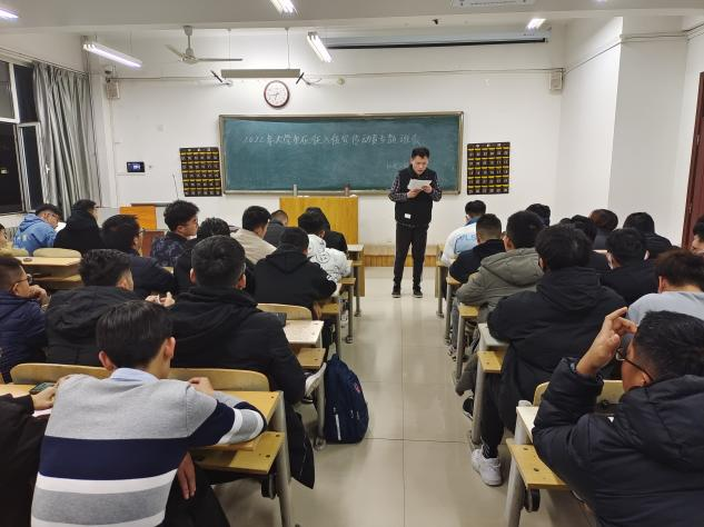为加强同学们对应征入伍相关内容的了解,动员同学们积极应征入伍,12月12日晚6点30分,机电工程公司于八教开展2022年老员工应征入伍宣传动员主题班会,此次班会由各班班主任主持召开,机电工程公司全体同学参加。