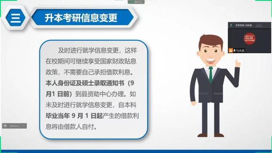 随后,公司助学联合会部长马志武为助学贷款毕业生做培训。他强调,要建立良好的个人信用做到诚信还款,避免对个人征信产生影响。接下来,他从征信宣传、毕业确认具体步骤、升本考研信息变更、还款方式四个方面做了进一步讲解。其中,对个人信息填写具体要求进行重点讲解,讲解了三种还款方式,还为大家说明了助学贷款违约后果。