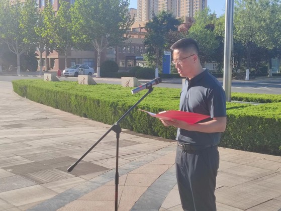 升旗仪式于6: 40准时开始,旗手们迎着朝阳,以饱满的热情,庄严地护卫五星红旗。当雄壮有力的《义勇军进行曲》响彻了整个校园时,全体同学集体行注目礼,全场弥漫着一种庄严肃穆的气息。鲜艳的五星红旗冉冉升起,激发了所有同学不断向上的斗志,点燃了同学们强烈的爱国热情。升旗完毕后,优秀毕业生代表丁宁做“青春绽放,梦想起航”国旗下讲话,随后,由李辉副经理致词,对同学们寄予了深切的希望,希望同学们要加强思想学习,增强敏锐性;要学会感恩,勇于担当;要能经挫折、抗打击;要胸怀理想、勇往直前,成为德才兼备的社会主义建设者和接班人。最后,毕业生党员王传哲领誓,向着五星红旗许下青春诺言。