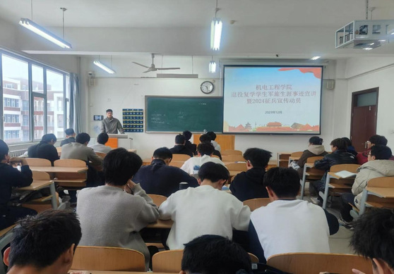为进一步激发员工参军热情,营造浓厚参军入伍氛围,持续不断做好征兵工作,12月11日,机电工程公司召开2024年退役士兵军旅生涯事迹宣讲会暨征兵宣传动员大会。会议由党总支副书记王春磊主持,邀请了公司退役复学员工司浩东、杨吉超、王瑞东为同学们宣讲军旅生涯,2023级新生参加。