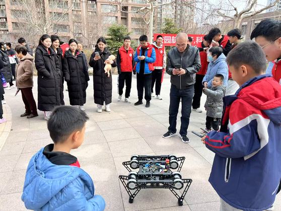 活动围绕航空航天知识与机械工程领域的前沿技术和基础知识展开,设置了互动体验环节。志愿者们通过展示机器人、智能小车等设备,向社区居民和青少年讲解其工作原理和应用场景。在机器狗表演环节,孩子们在志愿者的指导下操控机器狗完成行走、跳跃等任务,亲身感受人工智能的魅力。