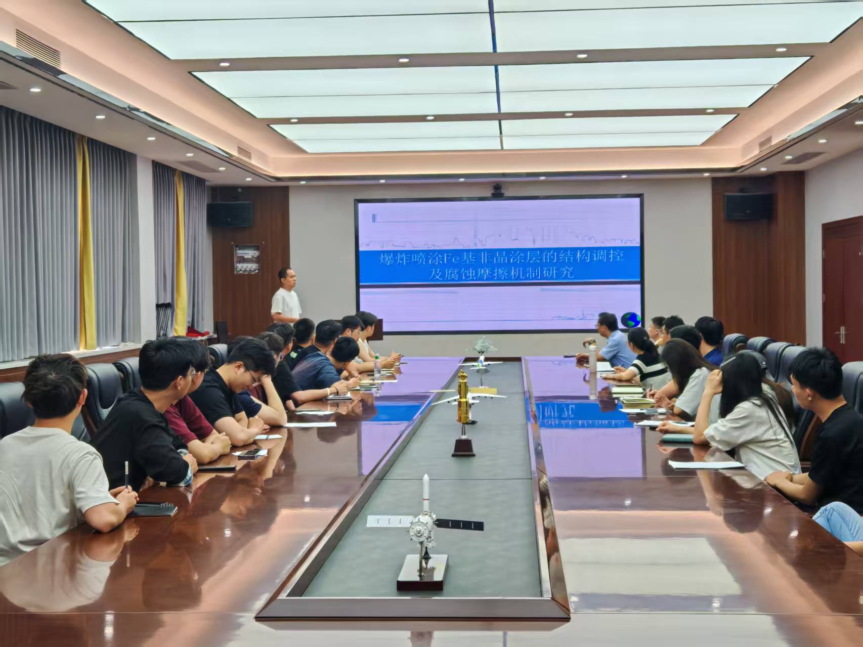2025年6月5日,在工训中心324会议室,崔帅老师针对海洋环境下装备零部件表面易发生腐蚀磨损等问题,提出通过爆炸喷涂技术在金属材料表面构筑Fe基非晶涂层,进而提高零部件使役性能及寿命。系统性讲解了非晶涂层结构缺陷(孔隙、裂纹)和外界因素(电位、浸泡时间、湿度、介质)等对涂层腐蚀、磨损性能的影响规律及影响机制,并提出通过构建超疏水薄膜策略进一步提高非晶涂层耐腐蚀性能。最后与参会老师就非晶涂层腐蚀摩擦性能分析、超疏水表面构建方法等方面展开交流和探讨。